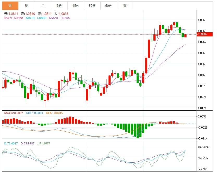 日线图显示,汇价自3月初以来整体保持在1.07上方震荡攀升,最高触及1.0954后有所回落。当前日线MACD仍在零轴上方,但柱状动能持续缩窄,反映多头动能放缓。RSI接近60附近徘徊,尚未出现明显超买信号。短期来看,1.074与1.0820一带构成重要支撑区域,若后续日线级别能持续收于该区间上方,则维持整体多头趋势不变。反之,一旦向下破位并伴随放量,则需警惕可能引发趋势反转或中期回调。