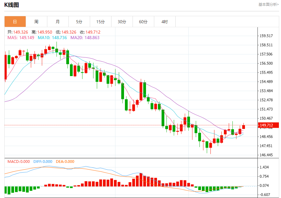 汇价高见149.950,低见149.326。上一交易日,汇价收于149.308。