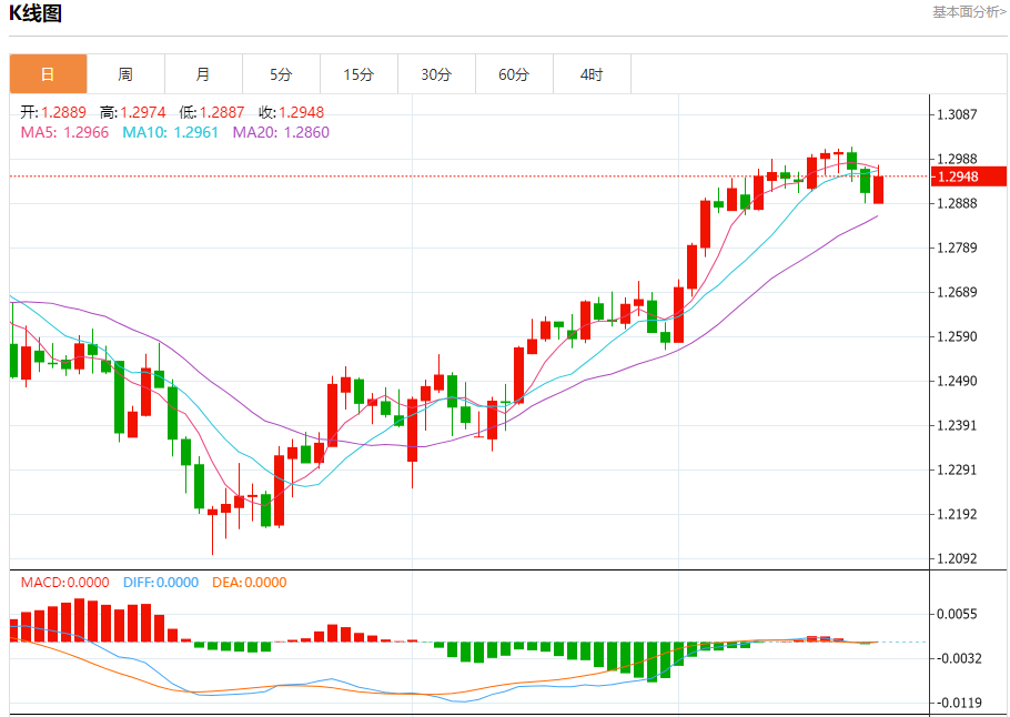 汇价高见1.2974,低见1.2887。上一交易日,汇价收于1.2913。