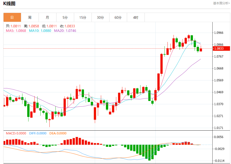 汇价高见1.0858,低见1.0811。上一交易日,汇价收于1.0812。
