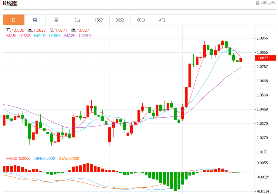 汇价高见1.0827,低见1.0777。上一交易日,汇价收于1.0800。