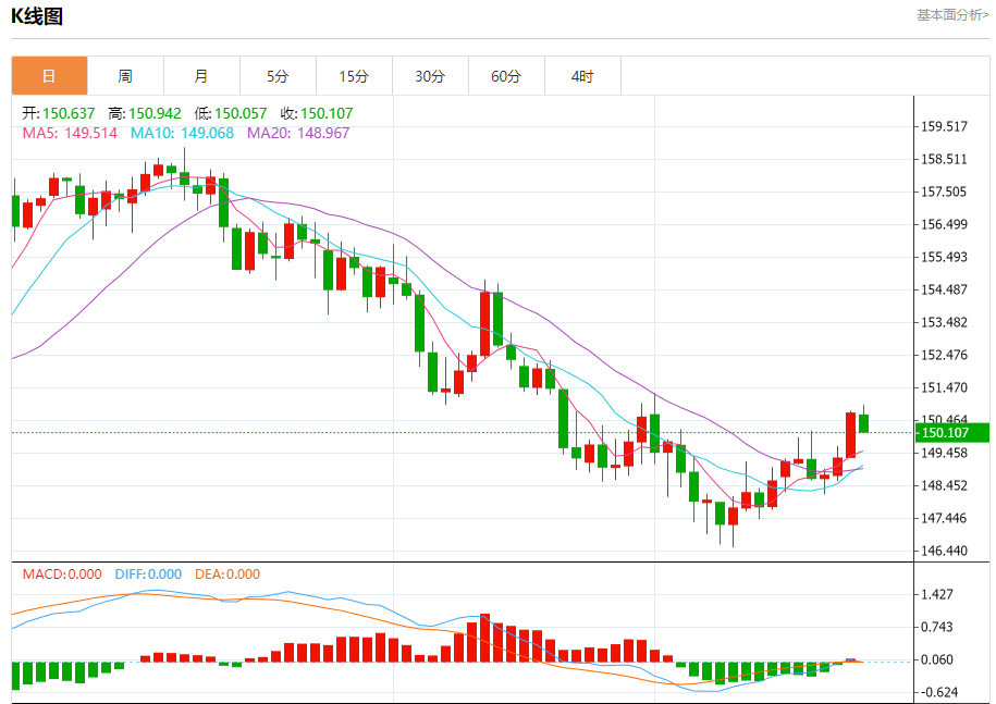 汇价高见150.942,低见150.057。上一交易日,汇价收于150.694。