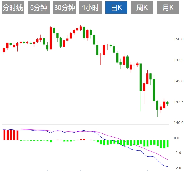日图整体受下降趋势打压,短线在前期低点141.60拉锯,等待进一步方向选择。4小时图小幅反弹,仍有进一步上行空间。小时图上行在143.15一线受阻回落,但在142.20上方寻得支持。