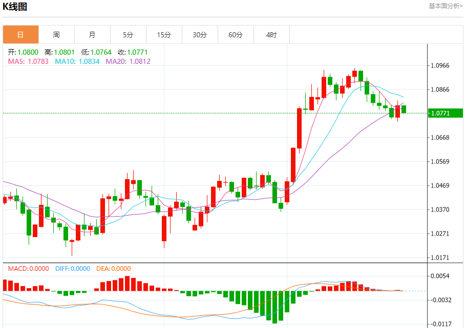 汇价高见1.0801,低见1.0764。上一交易日,汇价收于1.0800。