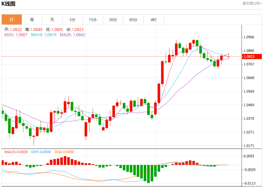 汇价高见1.0849,低见1.0805。上一交易日,汇价收于1.0830。