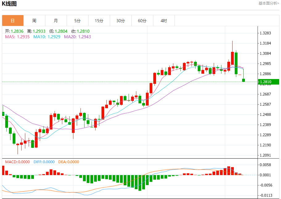 汇价高见1.2934,低见1.2804。上一交易日,汇价收于1.2877。