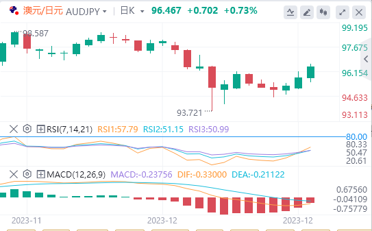 交易商将密切关注11月日本贸易帐和澳洲西太平洋银行领先指数(将于周三公布)。周五,日本将公布全国消费者物价指数。交易者将从这些数据中寻求澳元/日元交易机会。
