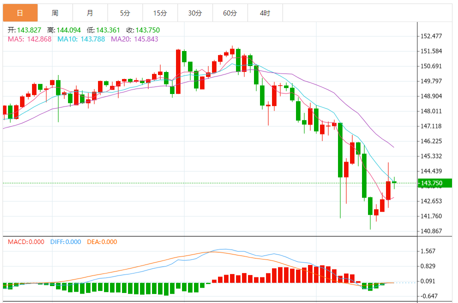 周三(12月20日),美元/日元下跌,暂报143.762,跌幅0.05%。