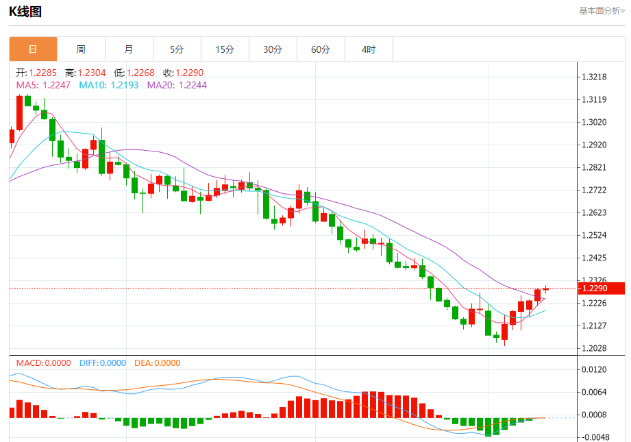 汇价高见1.2304,低见1.2268。上一交易日,汇价收于1.2286。