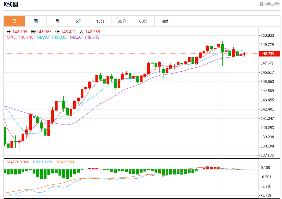 汇价高见148.963,低见148.421。上一交易日,汇价收于148.706。