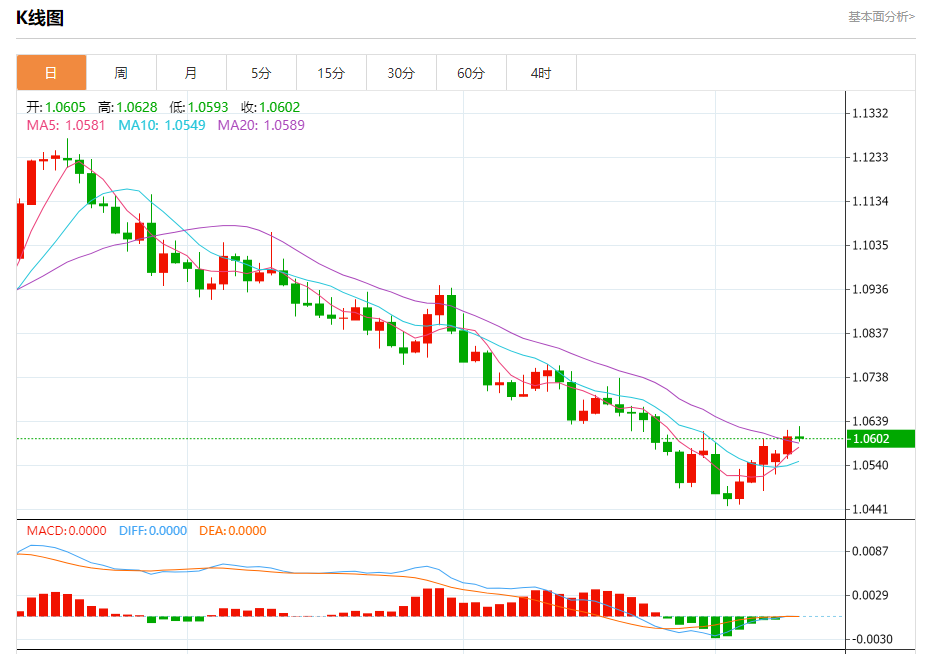 汇价高见1.0628,低见1.0593。上一交易日,汇价收于1.0605。