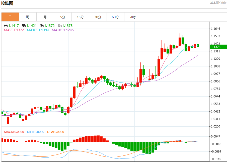 汇价高见1.1422,低见1.1373。上一交易日,汇价收于1.1421。