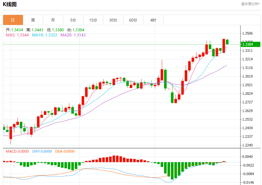 汇价高见1.3443,低见1.3380。上一交易日,汇价收于1.3433。