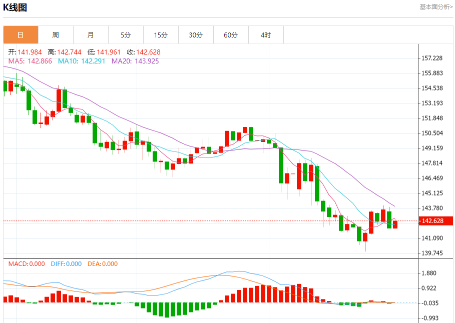 汇价高见142.752,低见141.960。上一交易日,汇价收于141.955。