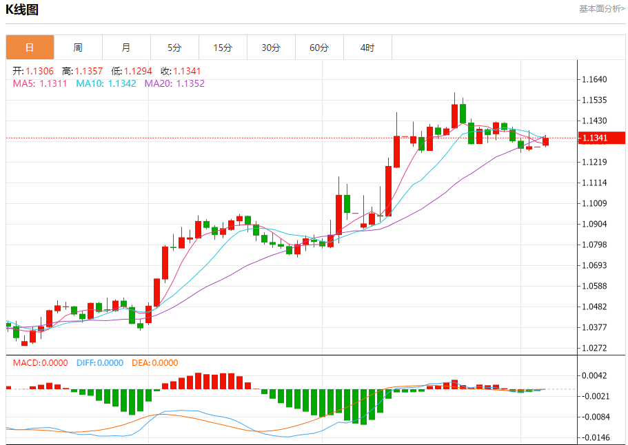 汇价高见1.1357,低见1.1293。上一交易日,汇价收于1.1297。