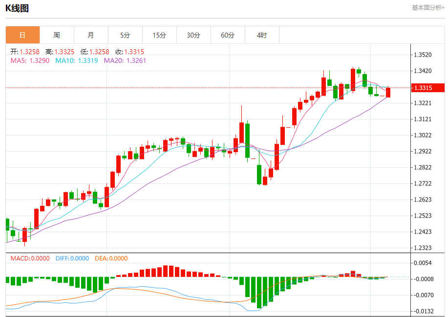 汇价高见1.3324,低见1.3247。上一交易日,汇价收于1.3266。