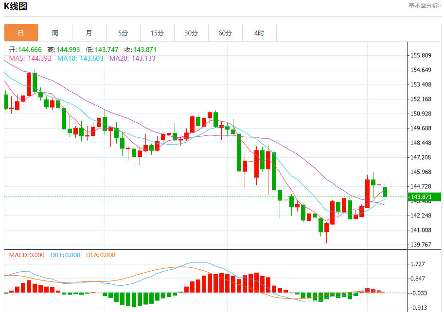 汇价高见144.978,低见143.738。上一交易日,汇价收于144.882。
