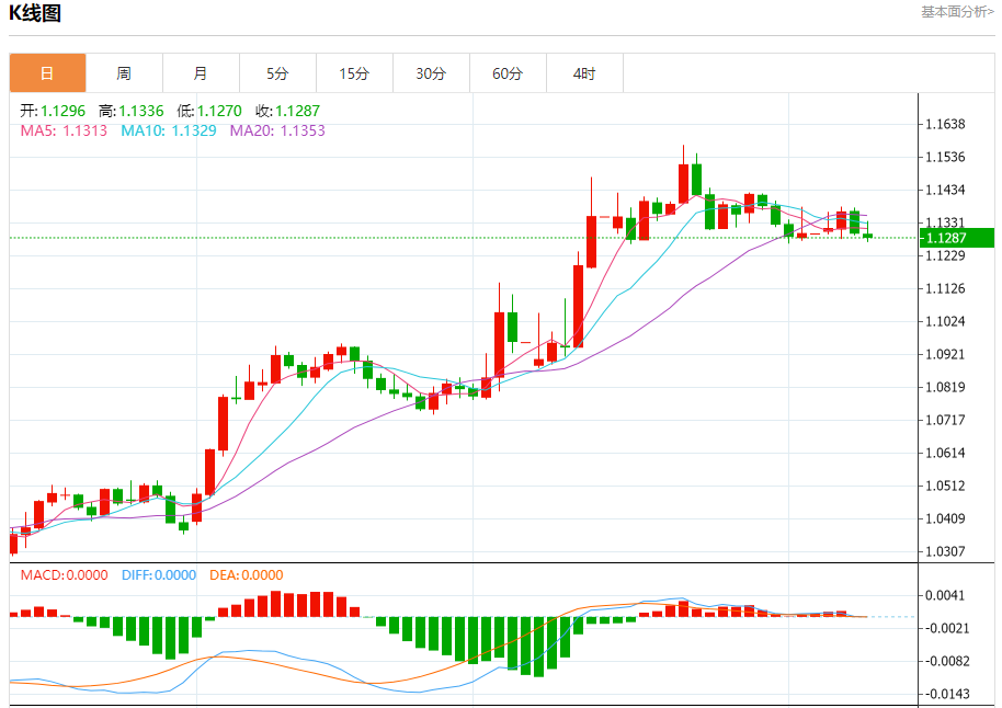 汇价高见1.1336,低见1.1270。上一交易日,汇价收于1.1300。