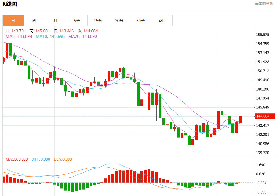 汇价高见145.001,低见143.443。上一交易日,汇价收于143.818。