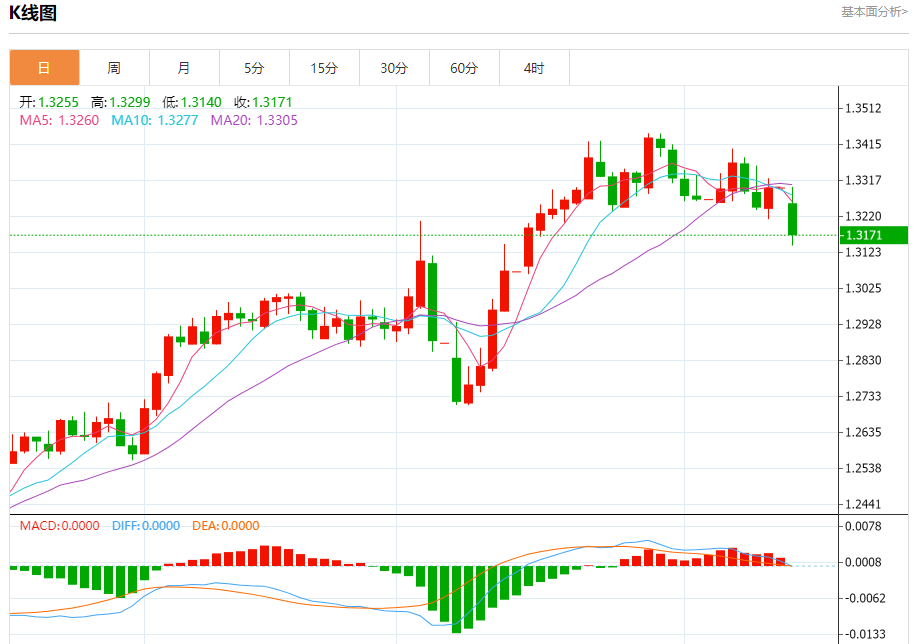 汇价高见1.3299,低见1.3139。上一交易日,汇价收于1.3297。