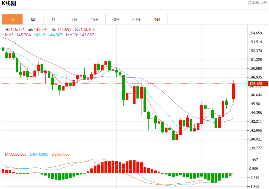汇价高见148.579,低见145.689。上一交易日,汇价收于145.340。