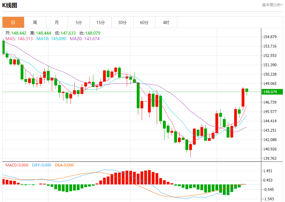 汇价高见148.453,低见147.641。上一交易日,汇价收于148.445。