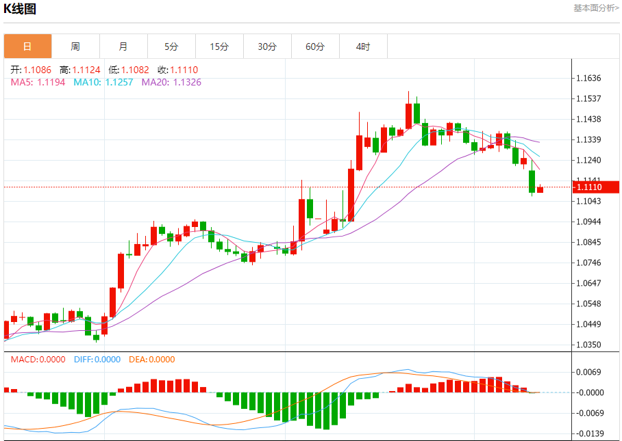 汇价高见1.1124,低见1.1082。上一交易日,汇价收于1.1086。