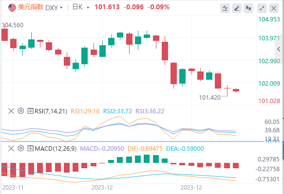 美元指数目前似乎维持在101.40上方,但总体观点继续为看空,短期内料跌至101或略低水平。考虑到圣诞假期的影响,本周的走势可能会出现震荡和横盘。但我们预计波动性将在2024年1月第一周上升。