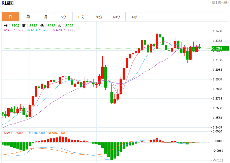 汇价高见1.3332,低见1.3282。上一交易日,汇价收于1.3304。