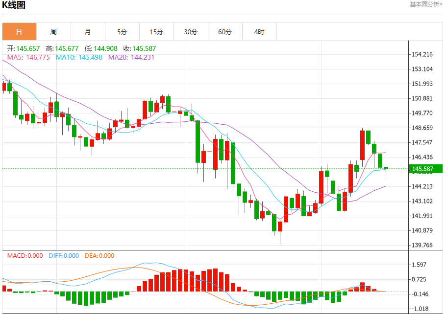 汇价高见145.677,低见144.908。上一交易日,汇价收于145.650。