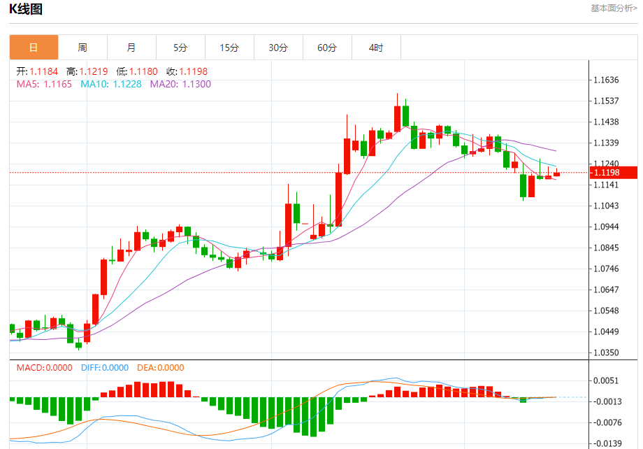汇价高见1.1219,低见1.1180。上一交易日,汇价收于1.1184。