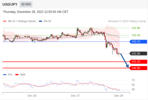 在 142.15 之下,看跌,目标价位为 141.20 ,然后为 140.90 。
