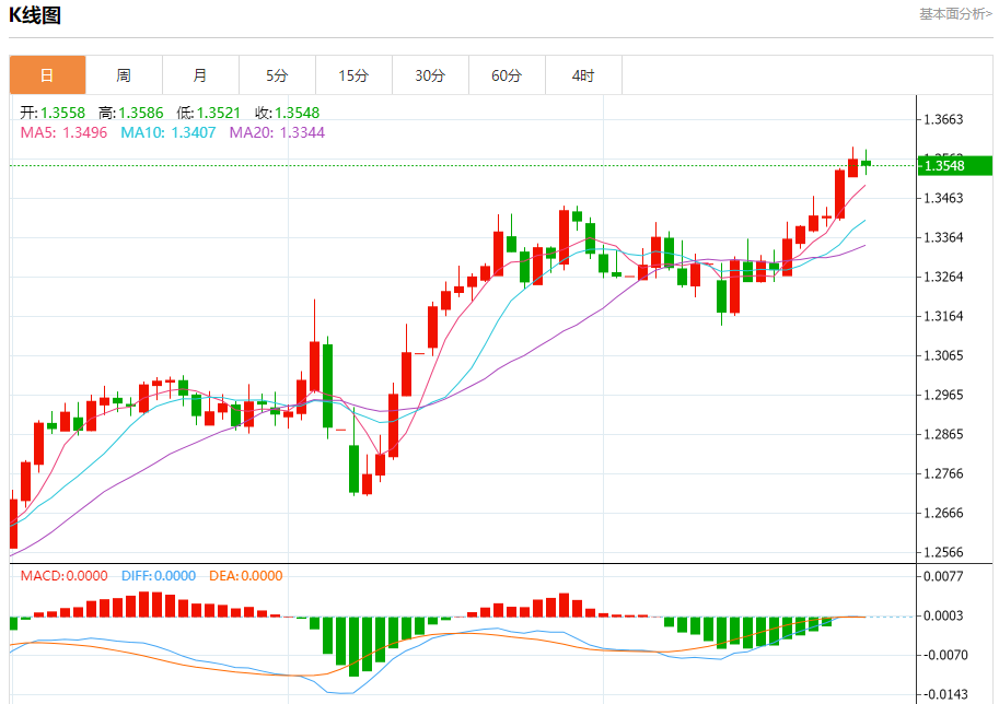 汇价高见1.3586,低见1.3521。上一交易日,汇价收于1.3562。