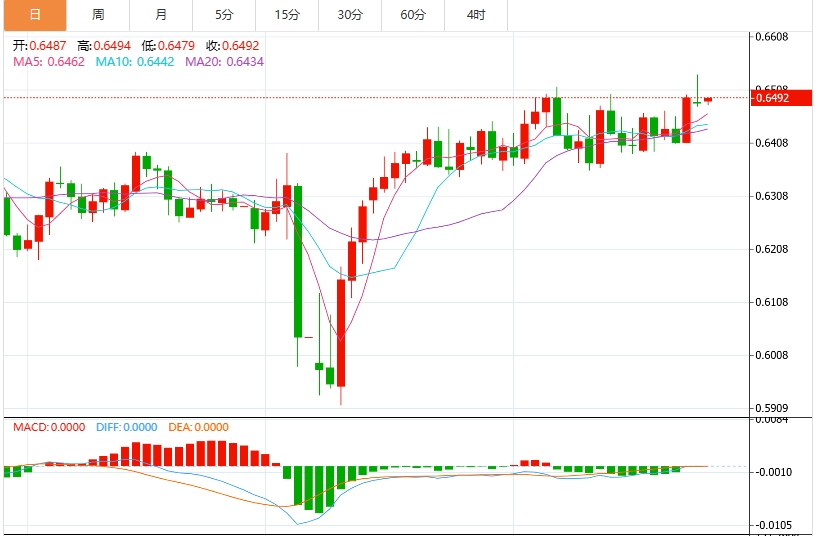 技术分析:澳大利亚元在回落至六个月高点后仍低于0.6500