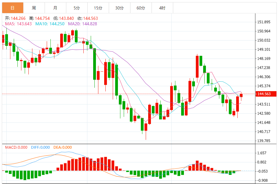 周三(5月28日),美元/日元上涨144.610,暂报143.282,涨幅0.19%。