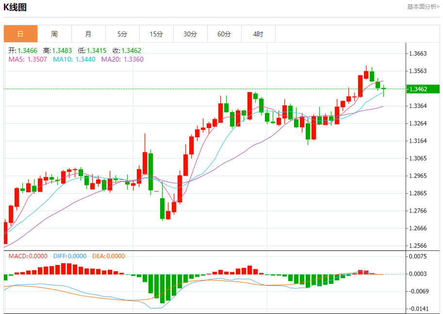 汇价高见1.3483,低见1.3415。上一交易日,汇价收于1.3467。