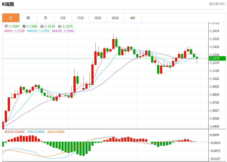 汇价高见1.1296,低见1.1210。上一交易日,汇价收于1.1291。