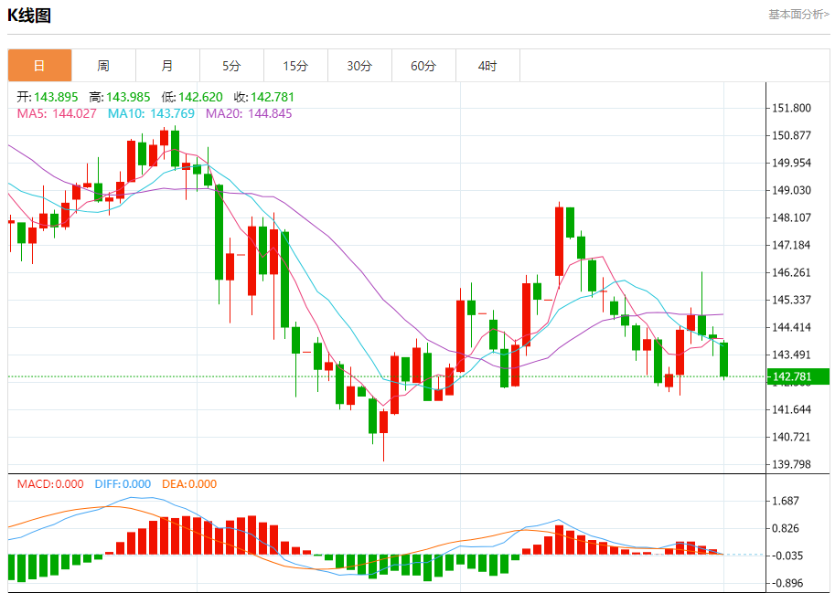 汇价高见143.985,低见142.620。上一交易日,汇价收于144.047。