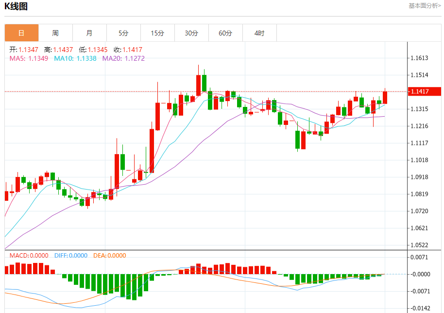 汇价高见1.1437,低见1.1345。上一交易日,汇价收于1.1345。
