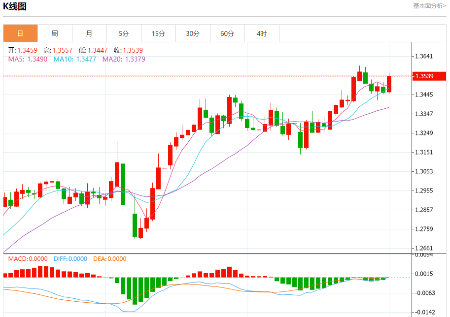 汇价高见1.3557,低见1.3448。上一交易日,汇价收于1.3454。