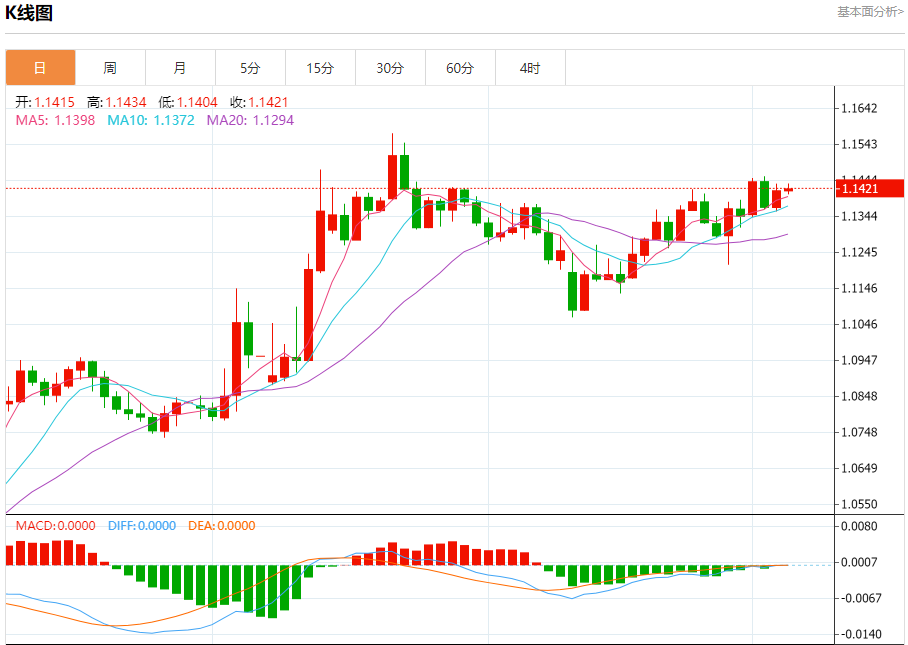 汇价高见1.1434,低见1.1405。上一交易日,汇价收于1.1417。