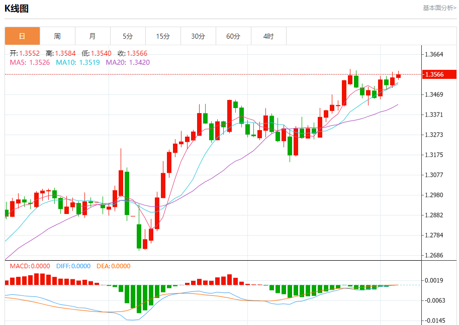 汇价高见1.3584,低见1.3540。上一交易日,汇价收于1.3552。
