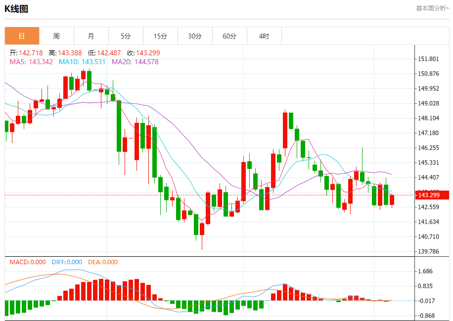 汇价高见143.396,低见142.529。上一交易日,汇价收于142.763。