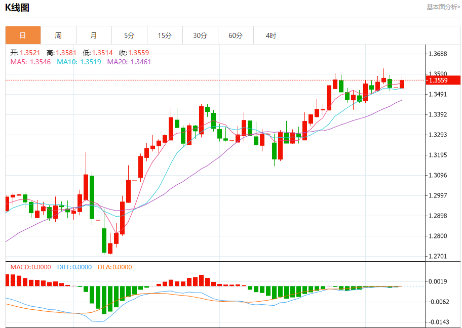 汇价高见1.3581,低见1.3514。上一交易日,汇价收于1.3524。
