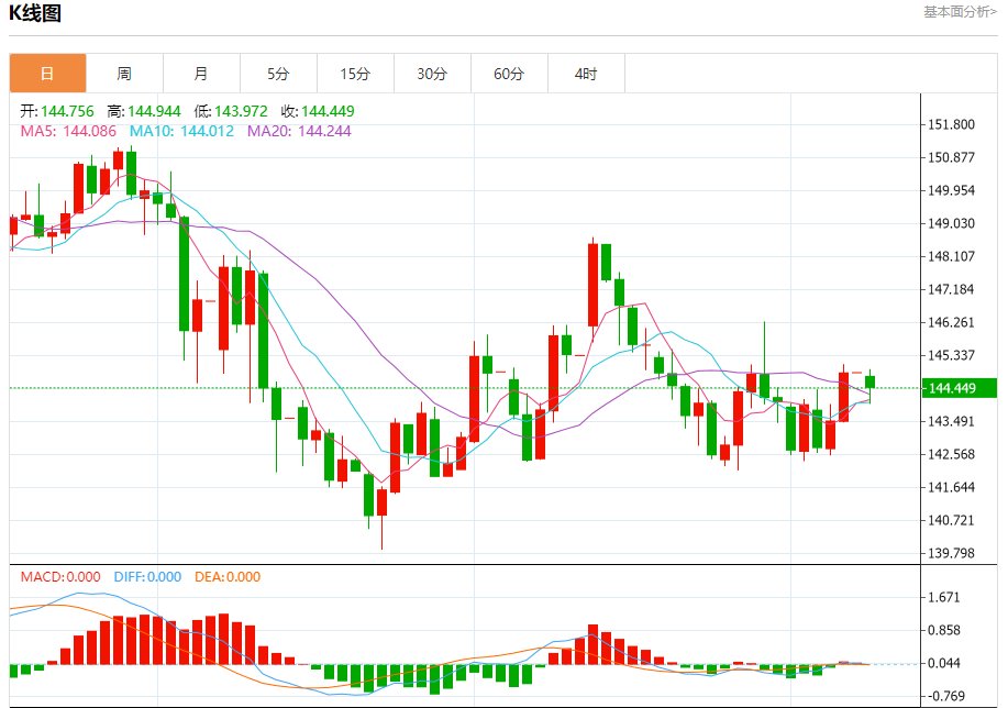 汇价高见144.944,低见143.972。上一交易日,汇价收于144.861。