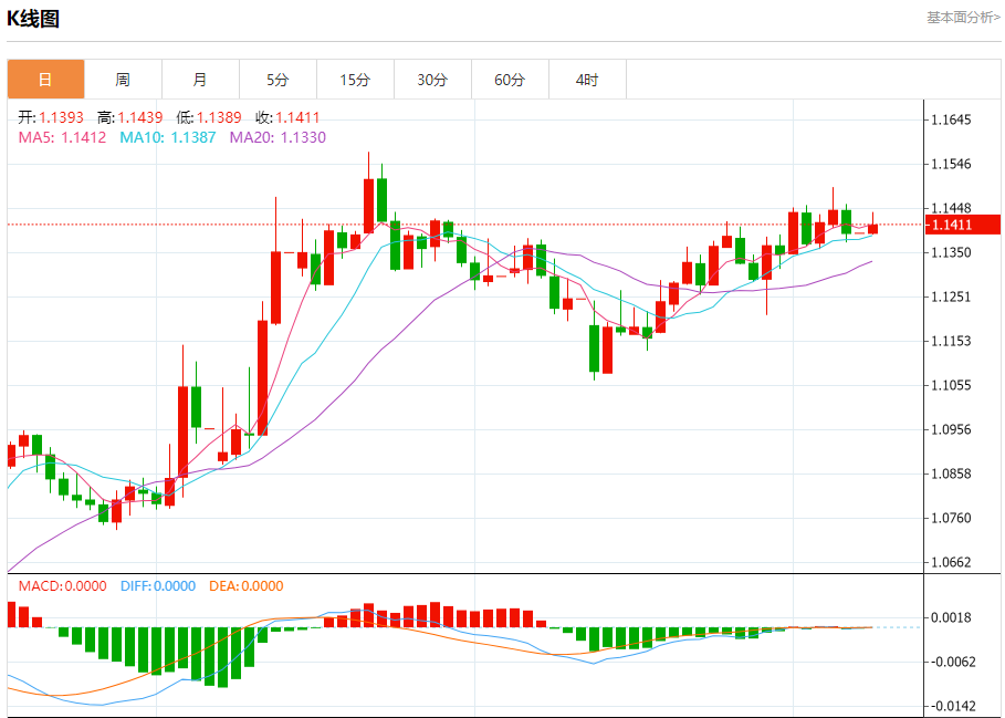 汇价高见1.1439,低见1.1389。上一交易日,汇价收于1.1393。