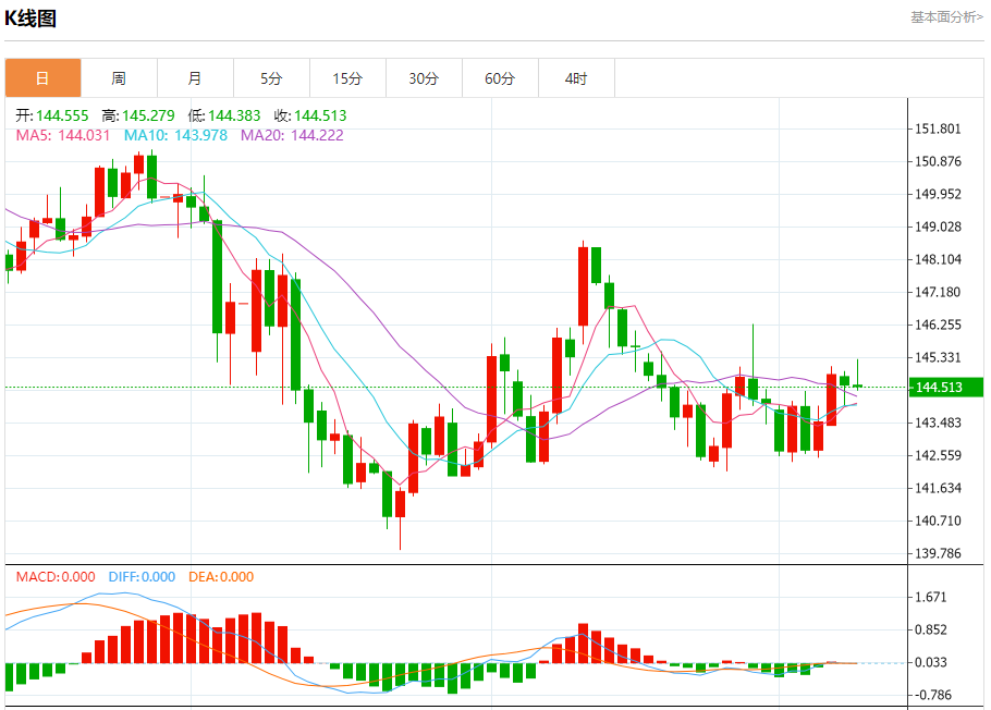 汇价高见145.279,低见144.383。上一交易日,汇价收于144.590。