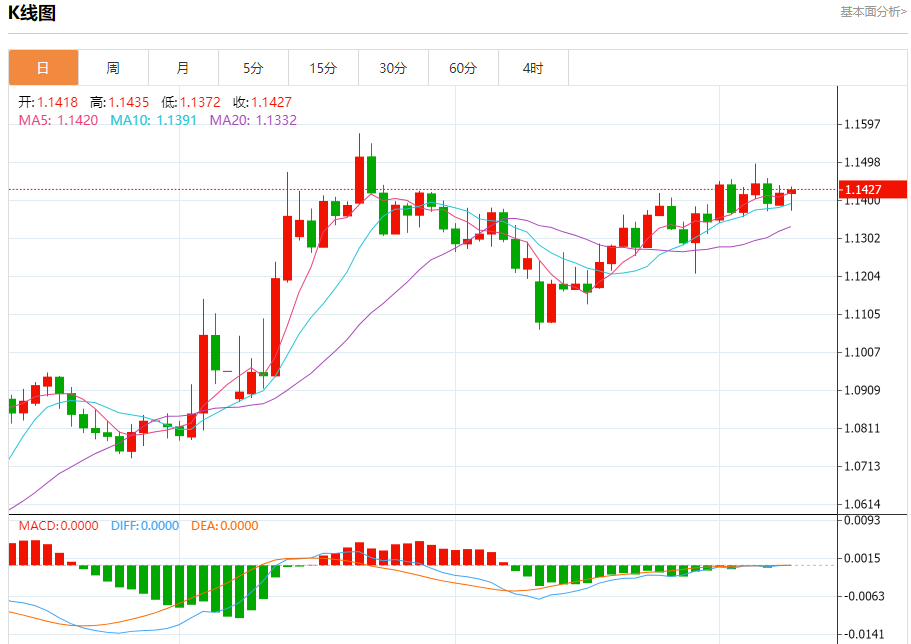 汇价高见1.1435,低见1.1372。上一交易日,汇价收于1.1420。