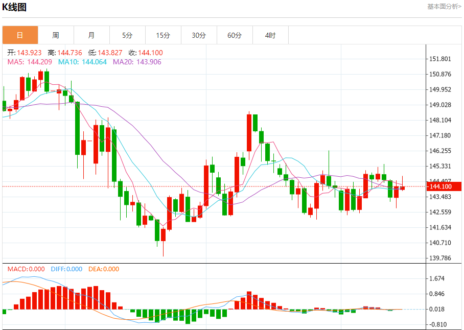 汇价高见144.743,低见143.922。上一交易日,汇价收于144.111。