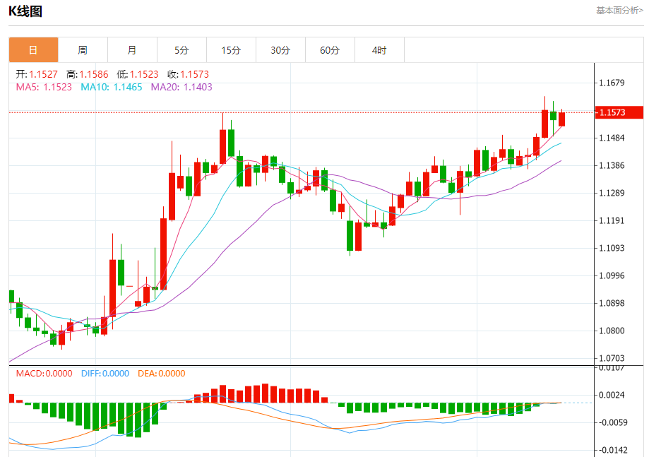 汇价高见1.1586,低见1.1524。上一交易日,汇价收于1.1549。